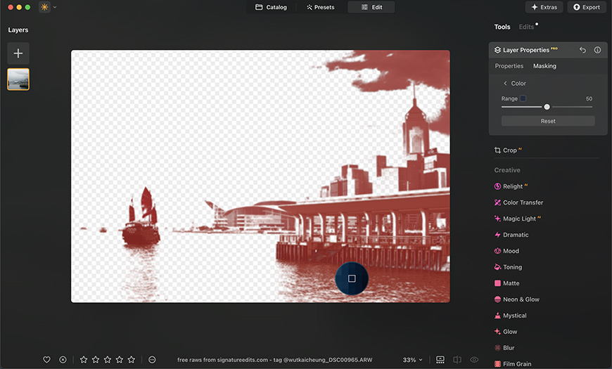 Then, there are two editing features: Color Transfer which allows you to mimic the color palette of any reference picture, and Color Masking, which helps you make precise adjustments.
