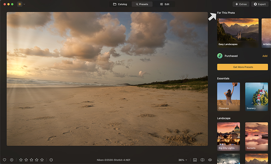 Numerous presets are supplied (with more available to download/buy), which apply instant photo effects to images to alter their look. AI identifies the image and suggests suitable ‘For This Photo’ Presets to save time.
